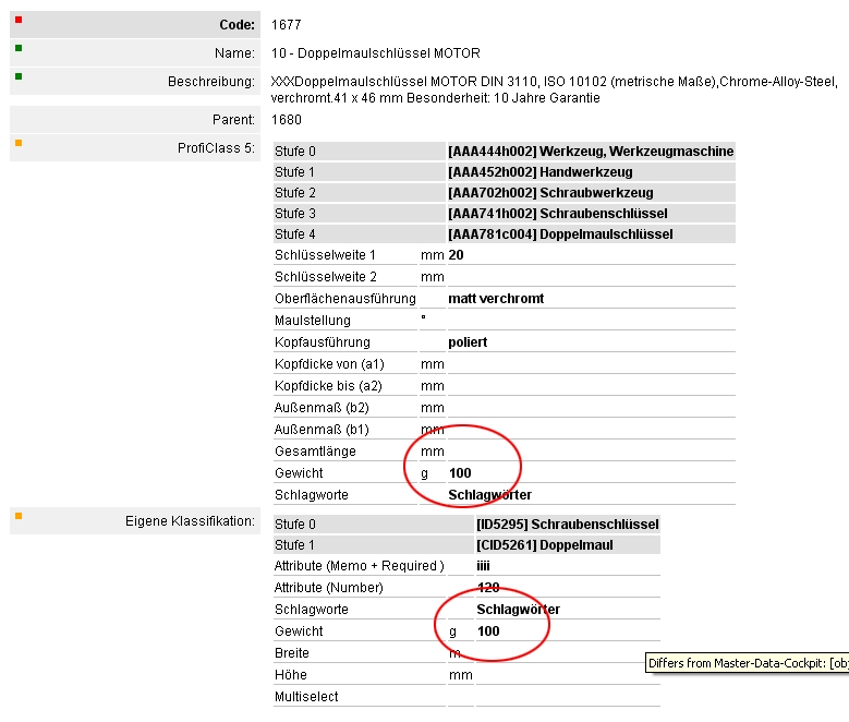 Werteübernahme zwischen 2 Klassifikationssystemen - hier der Wert für "Gewicht".