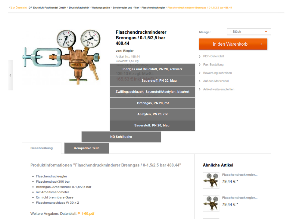 Screenshot: Automatische Identifizierung von passenden Produkten im Pneumatic Webshop - hier über die Eigenschaft "Gewindedurchmesser".