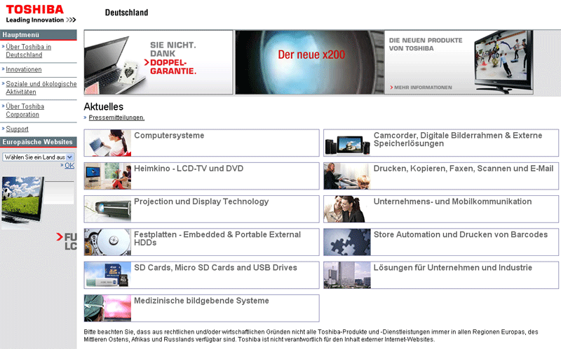 Die Toshiba Europe GmbH Neuss, gehört zum global agierenden Großkonzern der Toshiba Corporation, Tokyo, der auf eine 130-jährige Firmengeschichte zurückblicken kann. Heute gehört das Großunternehmen mit seinen 161.000 Mitarbeitern und einem Umsatz von rund 53 Mrd. US-Dollar zu den größten IT- und Elektronikfirmen weltweit. Im Geschäftsjahr 2007/08 betrug der Umsatz der Toshiba Europe GmbH 2,5 Milliarden Euro. Die Toshiba Europe GmbH in Neuss ist die europäische Zentrale für Produkte aus den Bereichen: Computersysteme, Projektoren, Speichermedien und Unterhaltungselektronik.